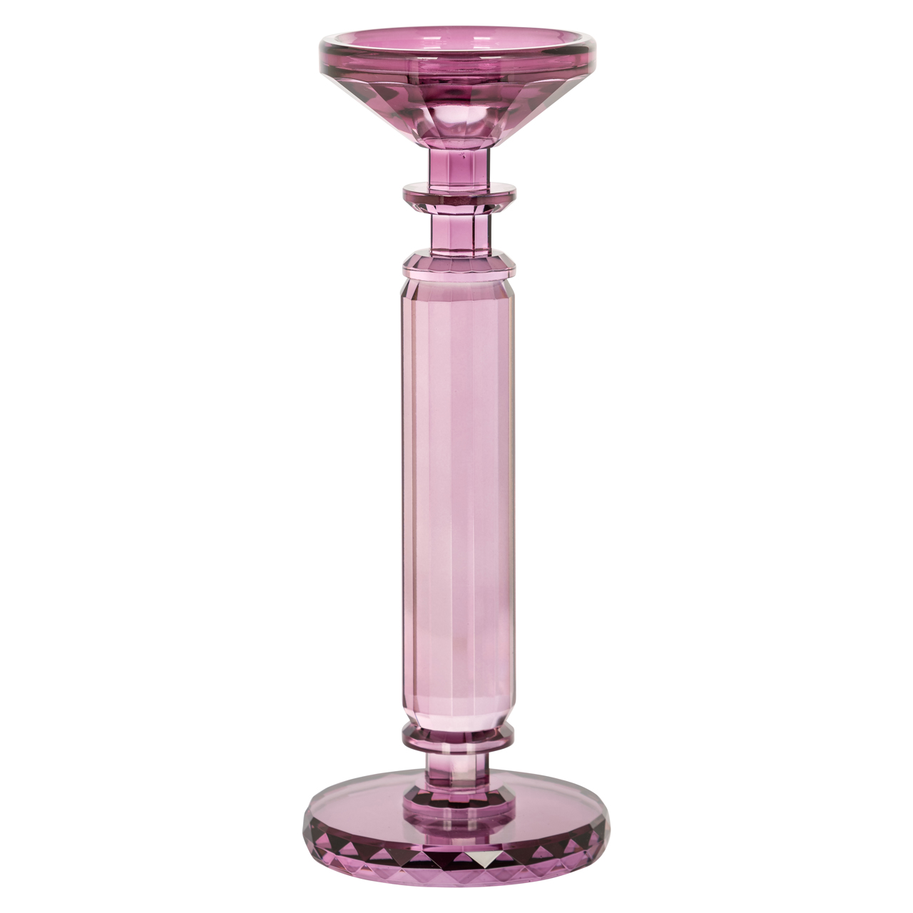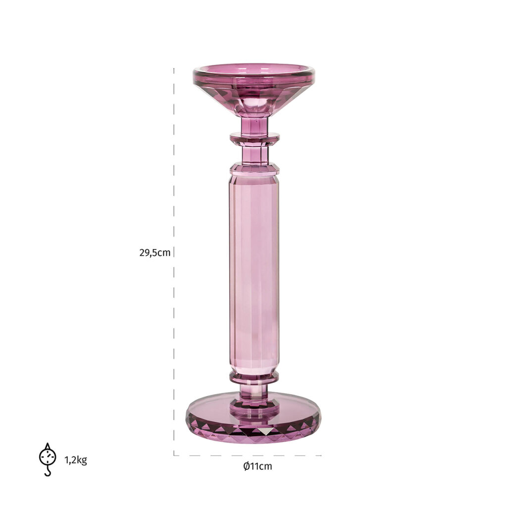 Deze verfijnde kandelaar is vervaardigd uit lichtpaars kristal dat bij elke lichtinval op betoverende wijze fonkelt. Het zachte paarse tintje van de Maysa kandelaar zorgt voor een rustgevende en elegante sfeer in elke ruimte. Wanneer er een kaars in brandt, wordt het licht op een prachtige manier weerkaatst door het kristal, waardoor er een sfeervol lichtspel ontstaat.