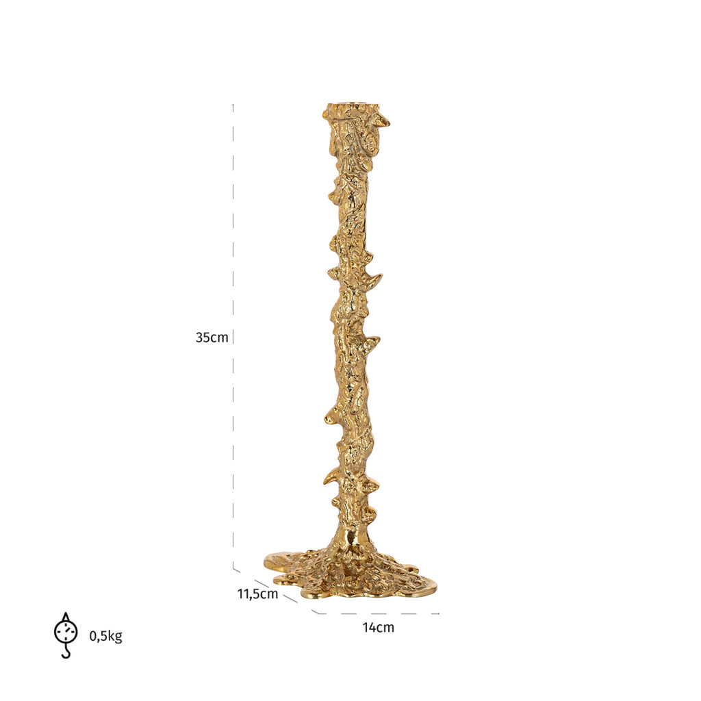 De Rayan kandelaar, vervaardigd uit glanzend goudkleurig aluminium, straalt pure elegantie en klasse uit. Zijn tijdloze design zorgt voor een stijlvolle toevoeging aan elke ruimte. Of je nu kiest voor de compacte kleine variant of de opvallende grote maat, de Rayan kandelaar is ontworpen om een indrukwekkend statement te maken in je interieur. Combineer beide formaten voor een gelaagd en luxueus effect.