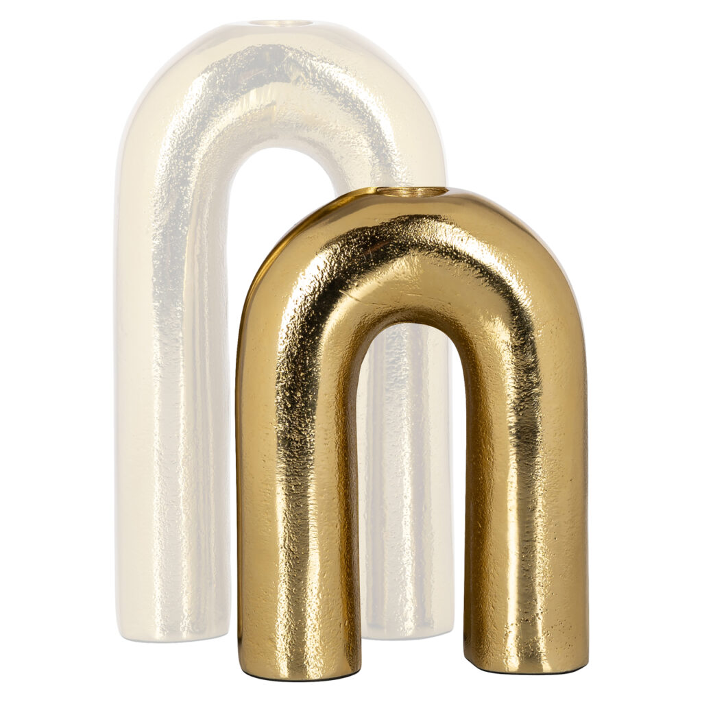 Ontdek de elegante Rowin kandelaar, een prachtig boogvormig ontwerp vervaardigd uit goudkleurig aluminium. Deze stijlvolle kandelaar voegt een vleugje glamour toe aan elke ruimte en is perfect voor het creëren van een warme en uitnodigende sfeer. Kies uit twee formaten, waaronder een grotere variant, om aan uw wensen te voldoen en uw interieur te verfraaien met een verfijnde touch.