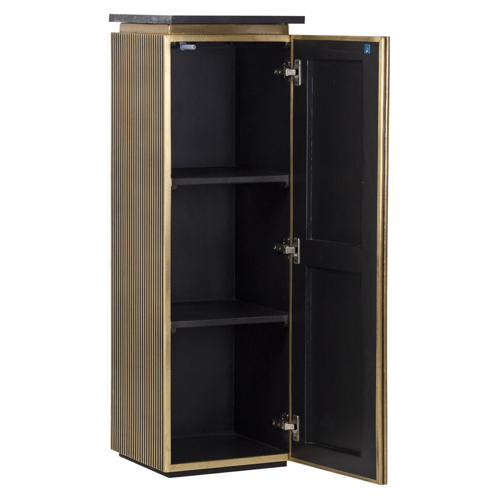 Maak kennis met de nieuwste aanwinst in de Ironville-serie: de Kolom Ironville 1-deur. Dit distinctieve stuk behoudt de geliefde kenmerken van de collectie, met een top van echt marmer en chique gouden accenten. Achter de enkele deur gaat voldoende opbergruimte schuil, ideaal voor het organiseren van uw persoonlijke spullen. Deze kolomkast combineert naadloos praktische opslag met een design dat een vleugje glamour toevoegt aan elk interieur.