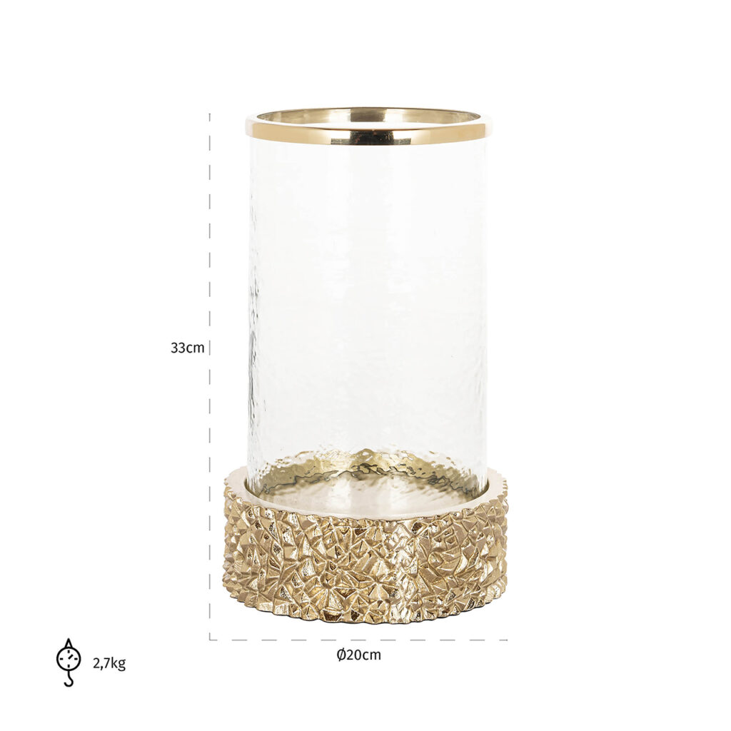 Het windlicht Jailey in goud is een elegante en sfeervolle toevoeging aan elk interieur. Met zijn luxe goudkleurige afwerking en verfijnd ontwerp creëert Jailey een warme en uitnodigende ambiance, perfect voor gezellige avonden. Het windlicht is geschikt voor kaarsen van verschillende formaten en verspreidt een zacht, diffuus licht dat een stijlvolle en serene sfeer oproept. Plaats Jailey op een dressoir, salontafel of buiten op een terras om een vleugje verfijning en warmte toe te voegen aan je ruimte. Perfect voor wie op zoek is naar een chic decoratief item met een functionele twist.
