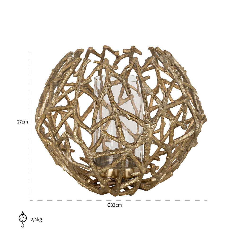 Ontdek het unieke Jaimy windlicht, een prachtig ontwerp vervaardigd uit hoogwaardig aluminium en glas, met een opvallend design in de vorm van een bos takken dat een vleugje natuurlijke schoonheid en warmte aan uw interieur toevoegt. Dit stijlvolle windlicht is perfect om kaarsen in te plaatsen en een gezellige sfeer te creëren in uw woonruimte. Het unieke ontwerp en de verfijnde uitstraling maken het geschikt voor zowel moderne als klassieke interieurs. Geniet van de charmante aanwezigheid en de verfijnde schoonheid die het Jaimy windlicht aan uw interieur toevoegt.