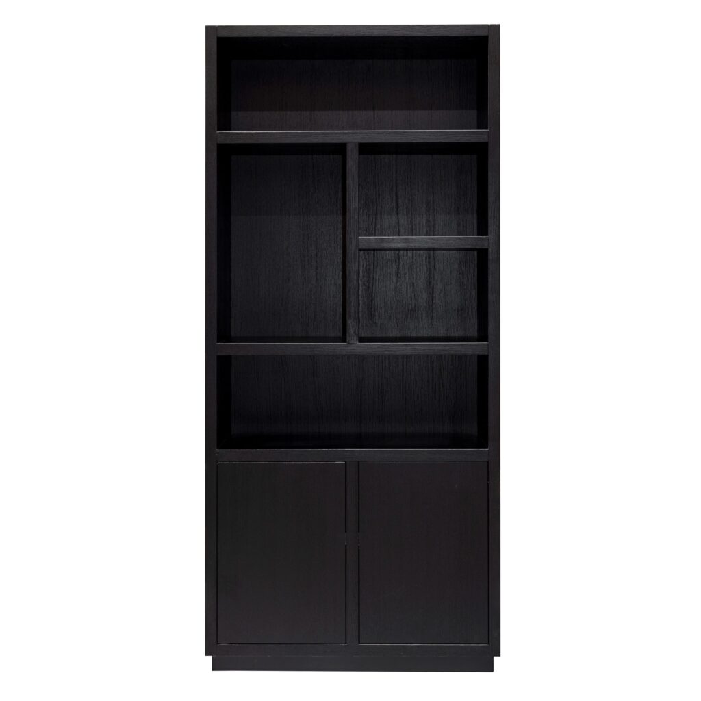 Boekenkast Oakura is boekenkast gemaakt van zwart eiken fineer. Basic met een stoere, chique touch. Open vakken met onderaan twee dichte deuren.