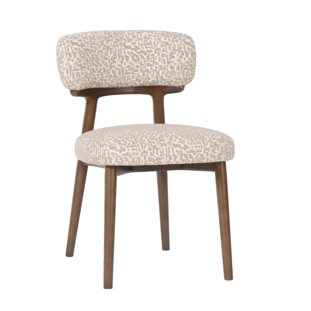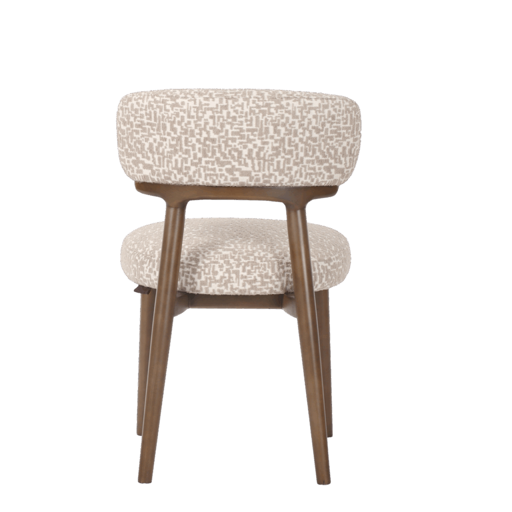 Eetkamerstoel Basker heeft zachte rondingen en een stevig beukenhouten frame. Bekleed met natural geo-stof en verkocht per set van twee. Een verfijnd ontwerp met een lichte uitstraling.