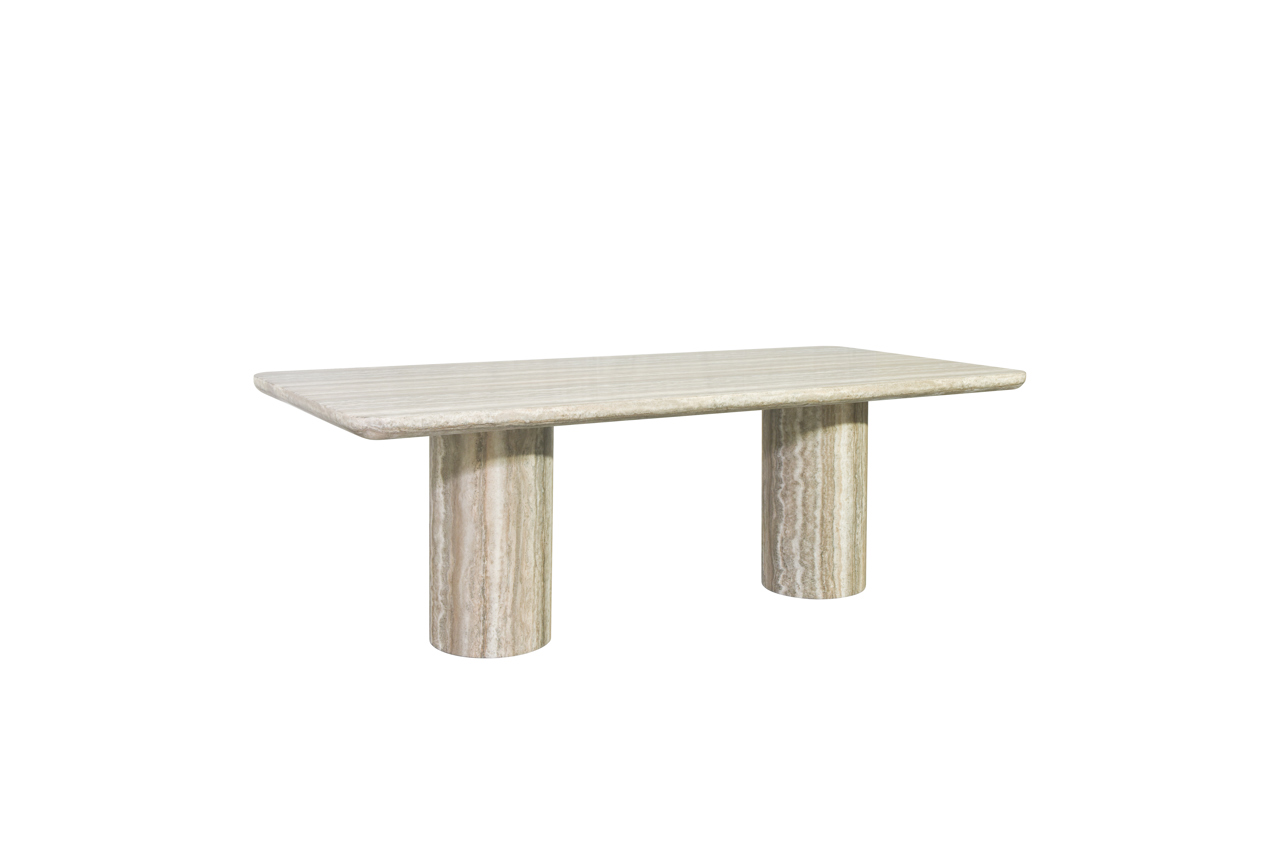 Eettafel Nebula combineert een gedurfd onderstel met een groot rechthoekig blad in grijze faux travertin. Een krachtig en tijdloos stuk met een sculpturale uitstraling.