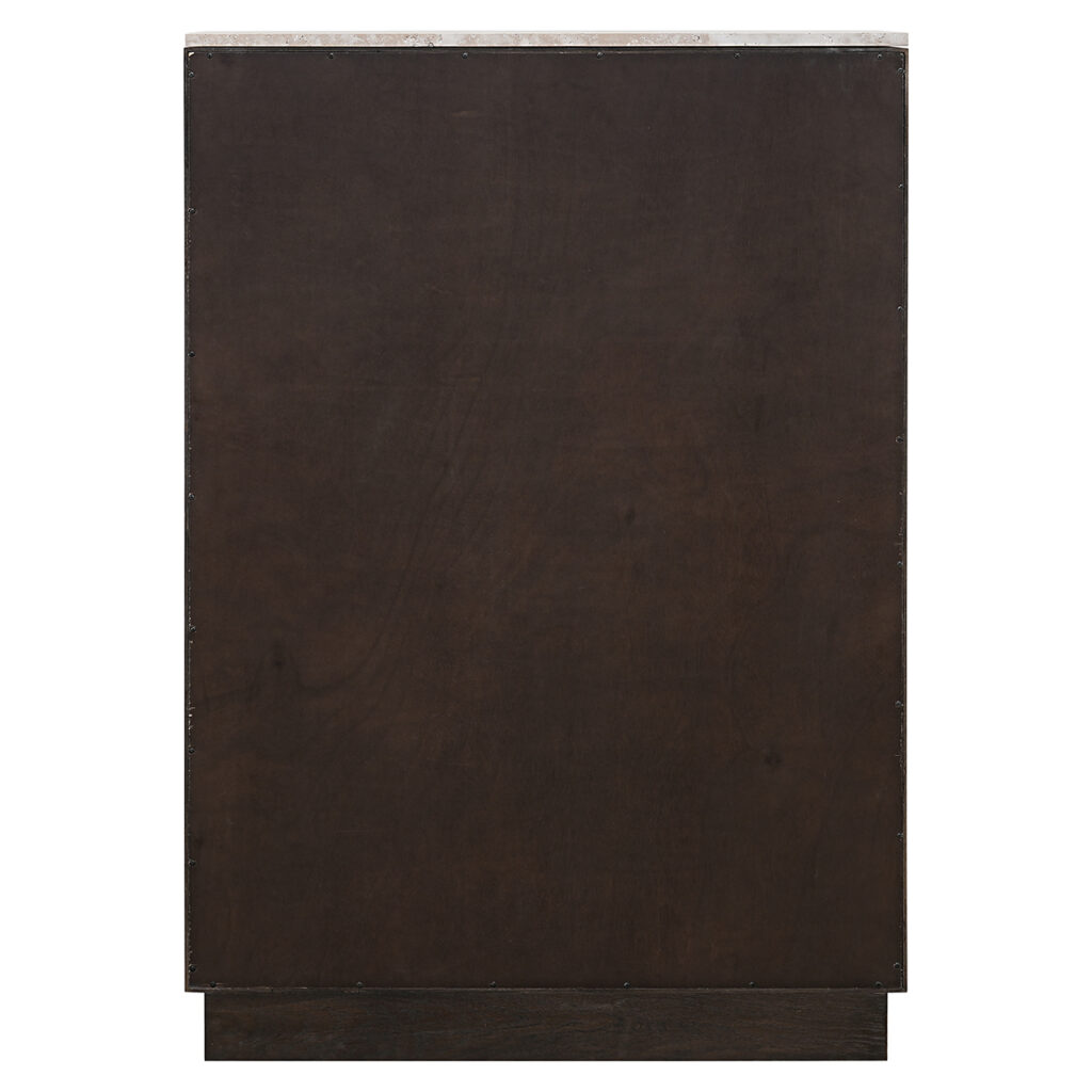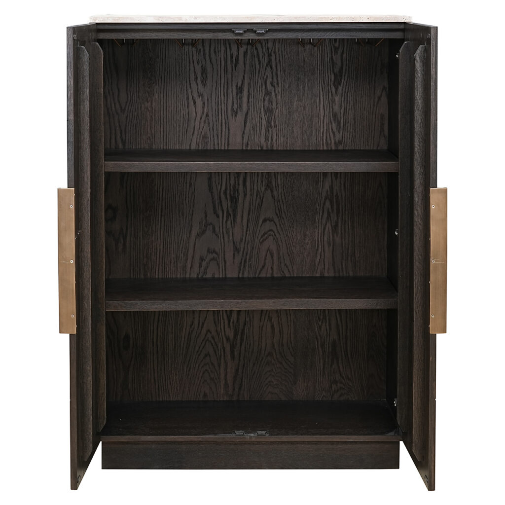 De Claremont wandkast is vervaardigd uit eikenfineer, eikenhout, travertine en hout, wat zorgt voor een robuuste en elegante uitstraling. De kast heeft twee deuren met een opvallend geometrisch patroon, wat een moderne en stijlvolle touch aan het ontwerp geeft. Het bovenblad van steen voegt een luxueus element toe, terwijl de solide constructie duurzaamheid garandeert. Deze wandkast biedt ruime opbergmogelijkheden en is een functioneel en esthetisch aantrekkelijk meubelstuk voor verschillende interieurstijlen.