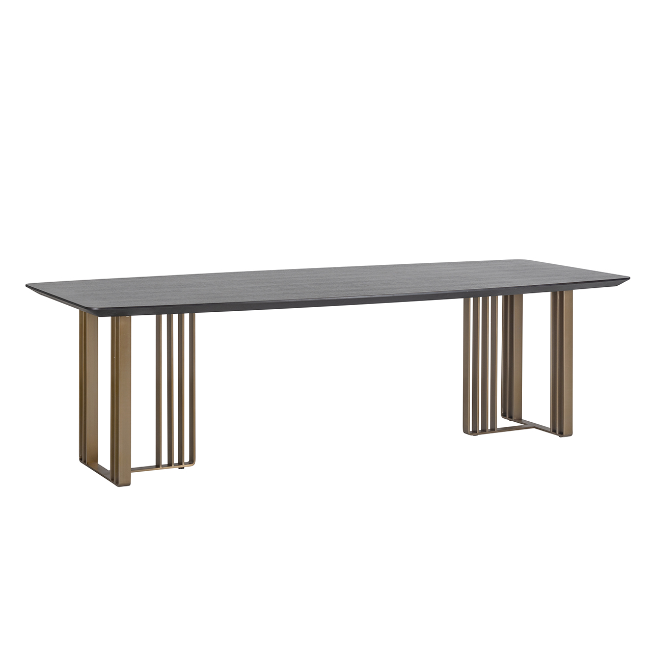 Eettafel Maverick, vervaardigd van een eiken fineer blad in de kleur ‘charcoal’ zwart. Het zogeheten Deens Ovaal gevormde blad is ondersteund door geborstelde gouden onderstellen. Zeer bijzonder design! Eettafel Maverick wordt geleverd in verschillende lengtes: 220, 260 en 300 cm.