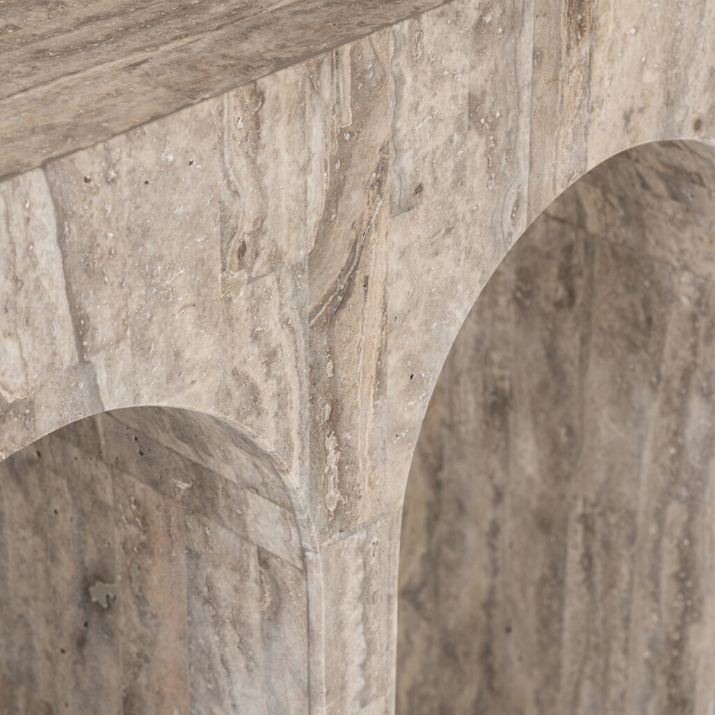 De La Rague wandtafel is een elegant meubelstuk, vervaardigd uit een combinatie van travertin en glasvezel. Het ontwerp is geïnspireerd op klassieke architectuur, met vier bogen die de tafel een tijdloze en statige uitstraling geven. De natuurlijke grijze tint van het travertin voegt een rustieke charme toe, terwijl de glasvezelconstructie zorgt voor stevigheid en duurzaamheid. Deze wandtafel is een verfijnde toevoeging aan elk interieur, ideaal voor het tentoonstellen van decoratieve objecten of als stijlvol accent in de gang of woonkamer.