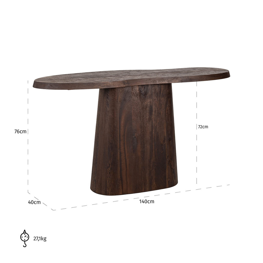 De Wandtafel Odile is een functioneel en decoratief stuk dat aan de muur kan worden bevestigd. Met zijn mooie bruine mangohouten blad en stevige constructie biedt het een handige plek voor het tonen van familiefoto’s of het opbergen van sleutels en post.